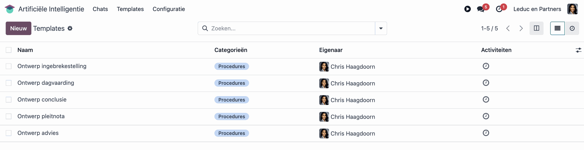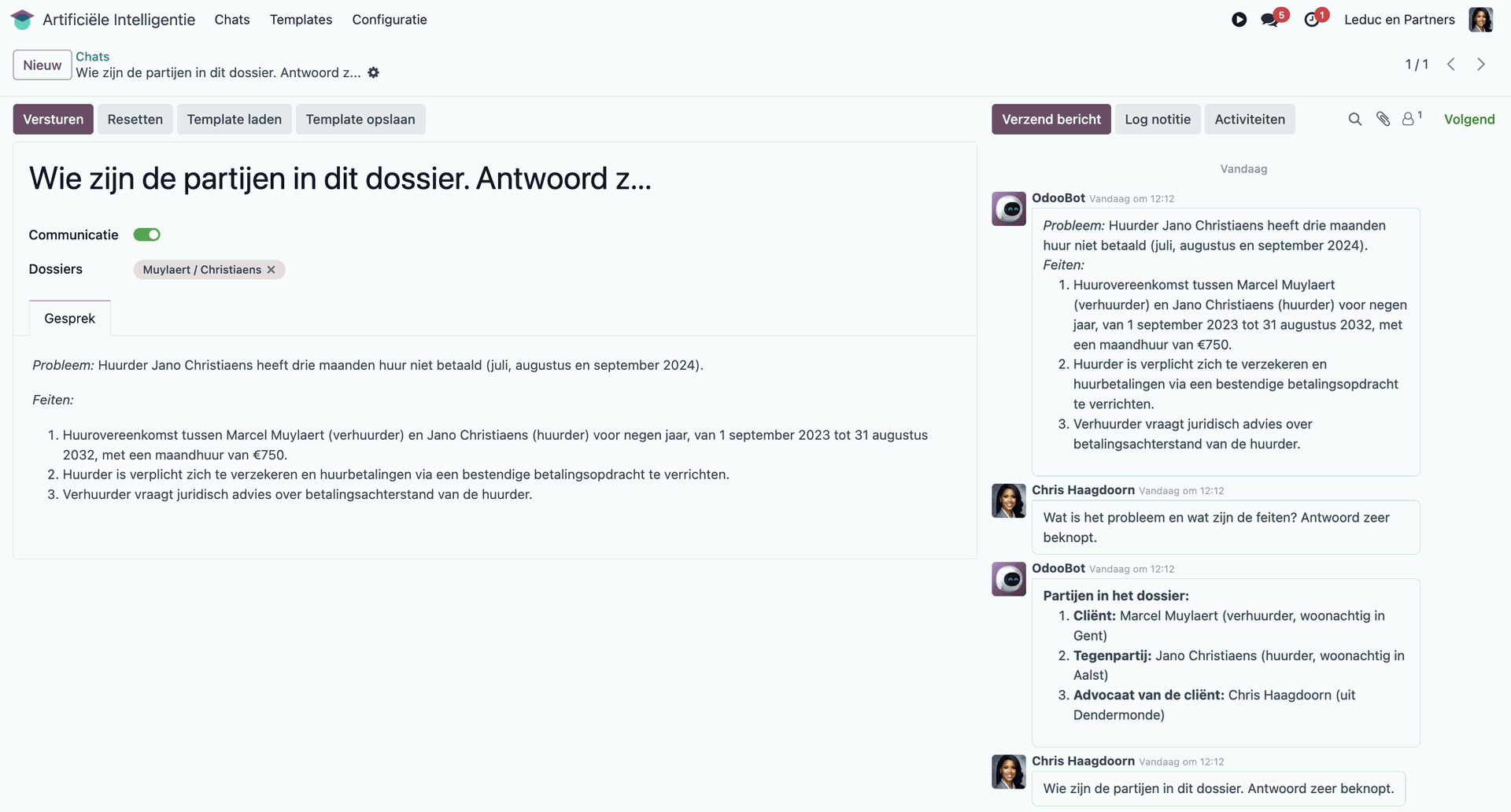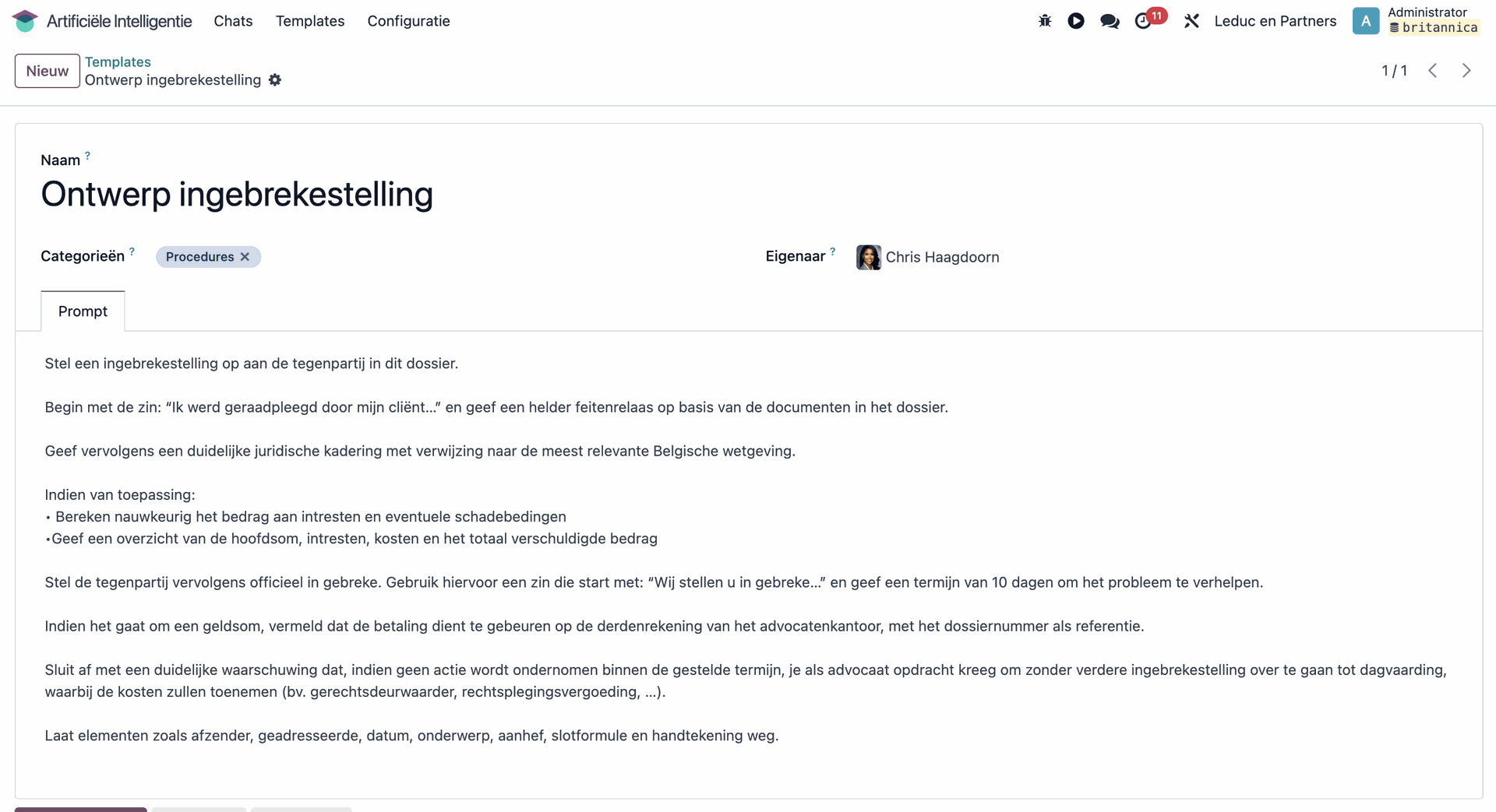 Voorbeeld: “Stel een ingebrekestelling op in zakelijke, juridisch correcte taal op basis van de geselecteerde dossierdocumenten. Begin met een samenvatting van de feiten, verwijs naar de relevante contractuele bepalingen, stel in gebreke en vermeld een betalingstermijn.”