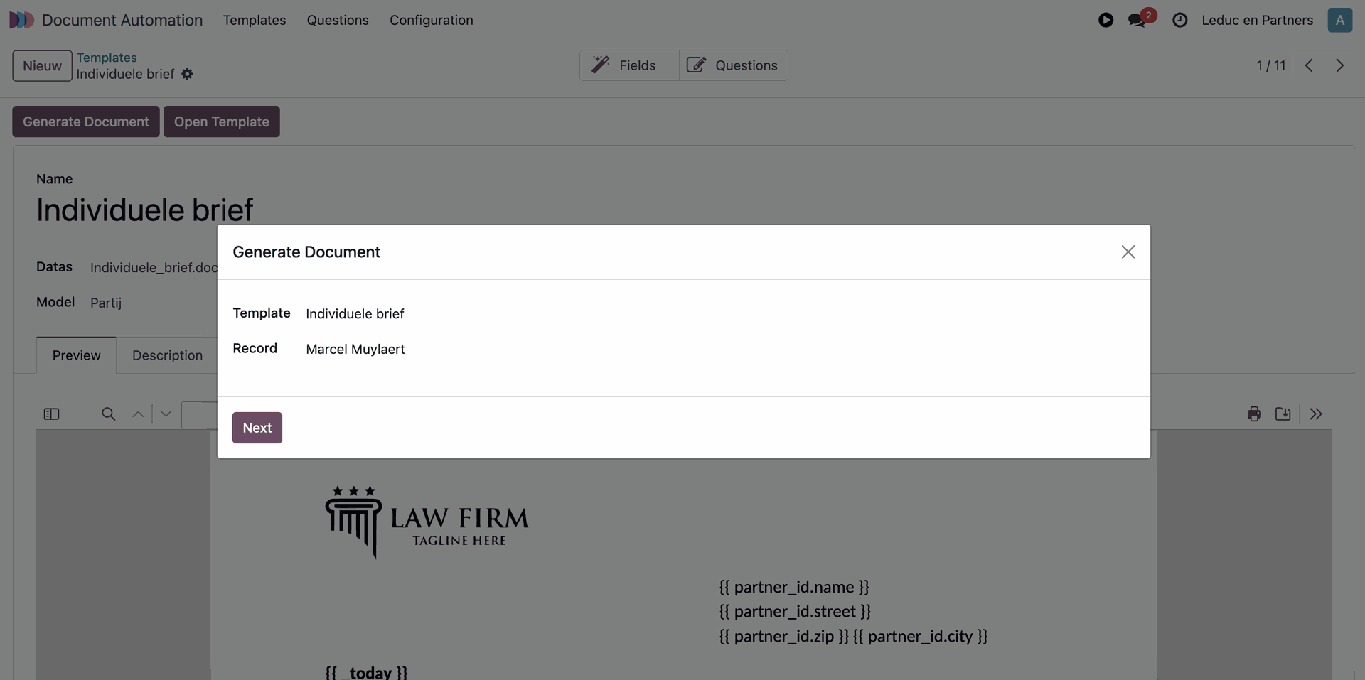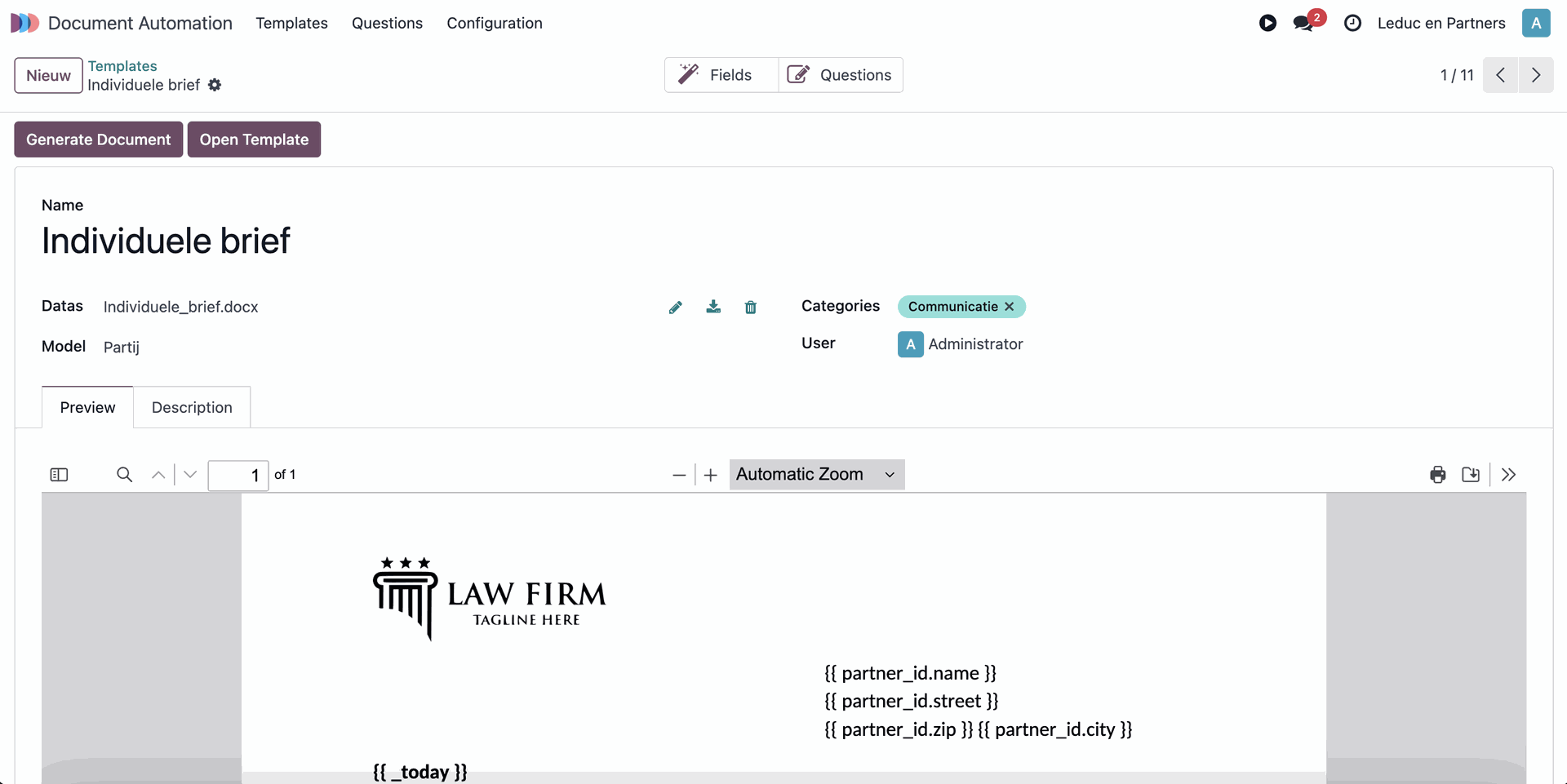 {{ partner_id.name }}Deze syntax wordt vervangen door de waarde van partner_id.naam.