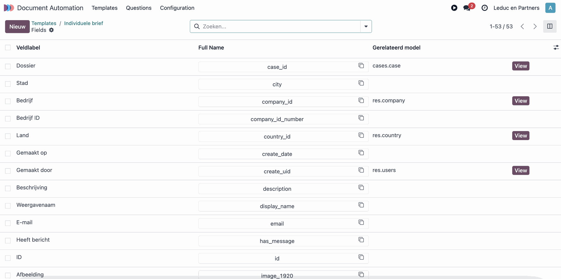 Een eerste manier is via de smartbutton "Velden" wanneer je een template opent in de Innoverius Document Automation app. Hier krijg je een overzicht van alle beschikbare velden binnen het gekoppelde Innoverius model: