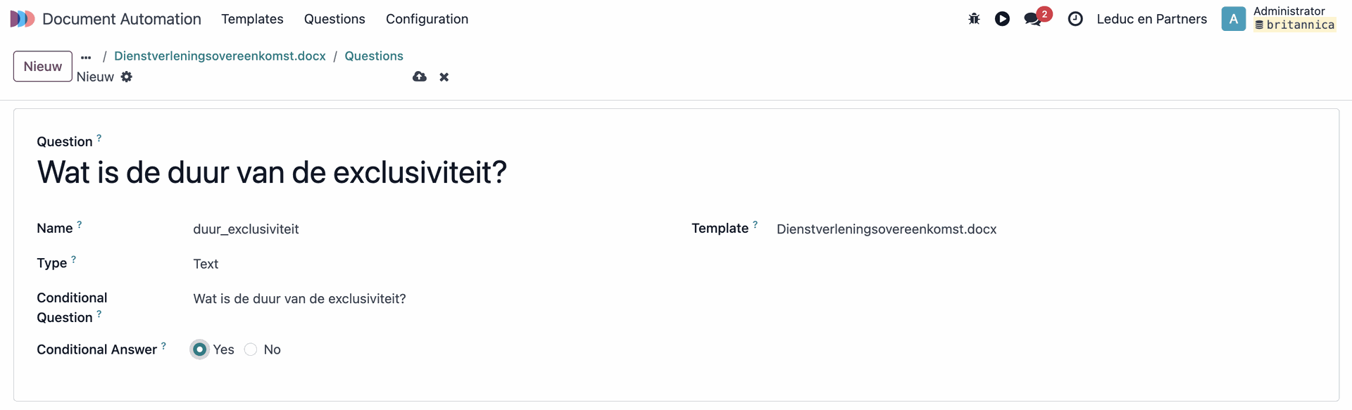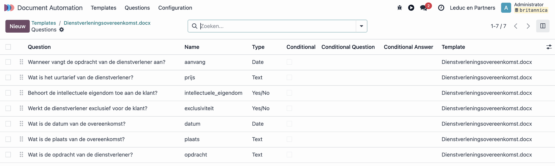 Voor elke template kun je via de smartbutton "Vragen" één of meerdere vragen definiëren die worden gesteld op het moment dat je een document genereert. Deze vragen kunnen verschillende soorten antwoorden opleveren:
