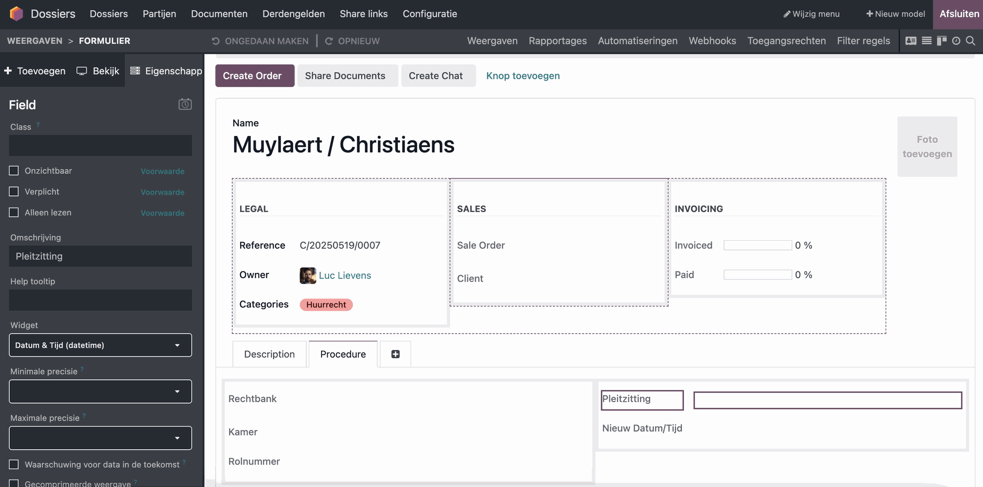 - Selecteer het juiste record van het bijhorende model (bijvoorbeeld een dossier of partij).