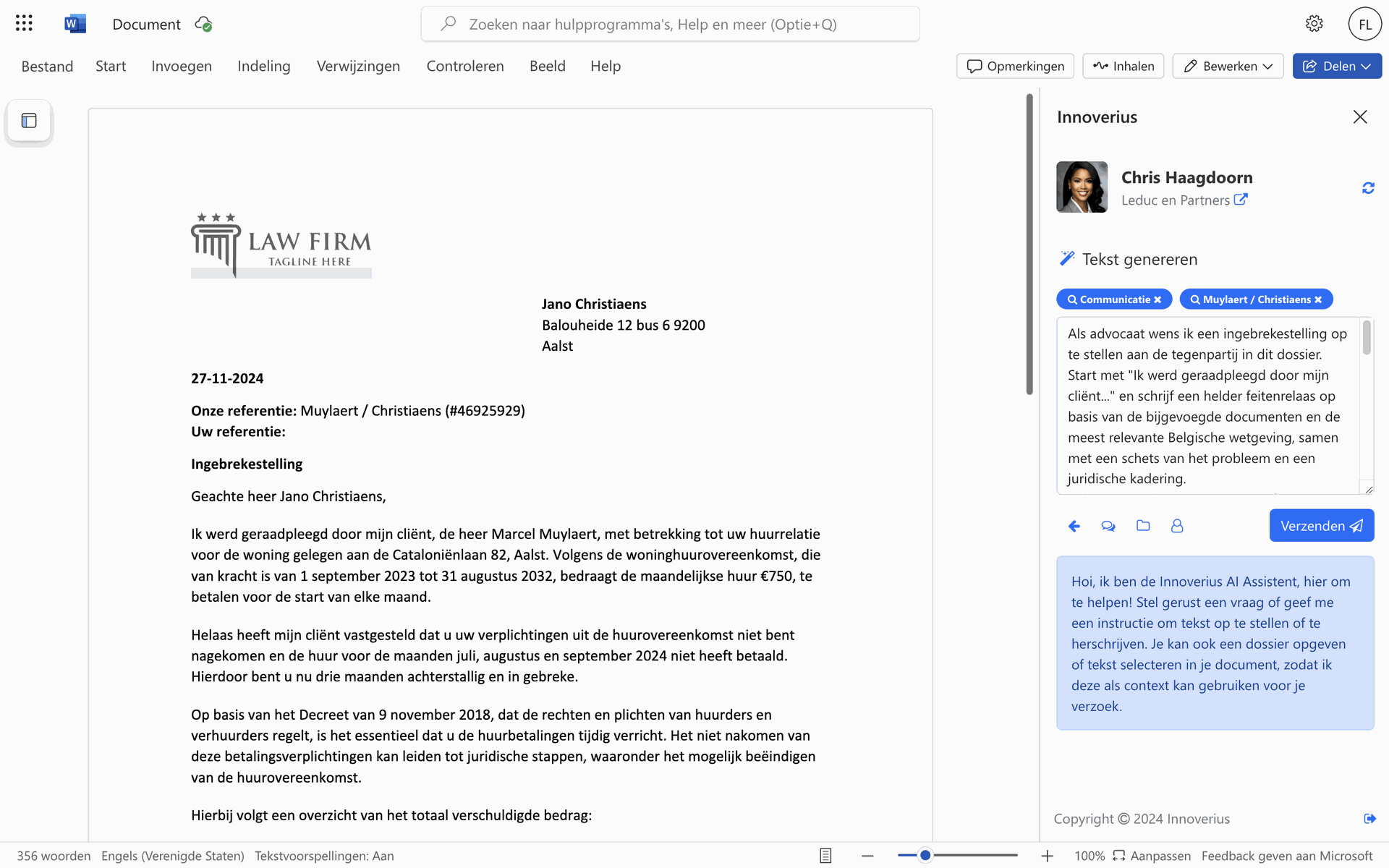 Creëer professioneel geschreven documenten direct in Word. De AI gebruikt de informatie in jouw dossiers om zo foutloos mogelijke, juridische teksten te genereren, volledig afgestemd op jouw zaak en in een handomdraai klaar.